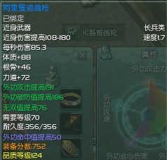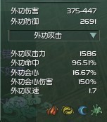 外功攻击1586、外功伤害375-447、外功会心伤害150%、武器伤害108-180。