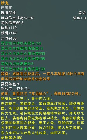 侠客岛自异域海客手中得之,海客云断鬼之杀意扰动其国之根器,奉王之命,乘船远弃。后东方宇轩得之携来中原,持之对敌,毁人兵刃无数,东方宇轩以为此笔太过凶厉,纳而不用。