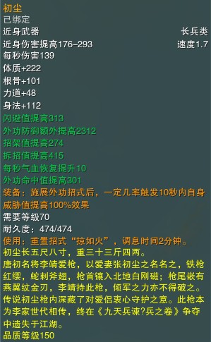唐初名将李靖爱枪,以爱妻张初尘之名名之,铁枪红缨,蛇刺斧翅,枪首镶入北地白刚磁;枪尾嵌有燕翼纹金刃,李靖持此枪,倾军之力亦不得破之。传说初尘枪内深藏了对爱侣衷心守护之意。
