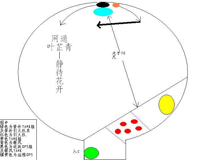 倒数开怪,MT先镖,餐风T再把餐风单拉过来,均拉到指定位置。图中,青色餐风距蓝色直线的每一个点都应该大于70尺(因为餐风的DEBUFF范围是70尺),T ANK组饮火距粉色直线大于30尺,距紫色直线小于60尺,保证引火队员距离饮火30尺到60尺之间。当诸BOSS到达指定位置后,进入第一阶段。