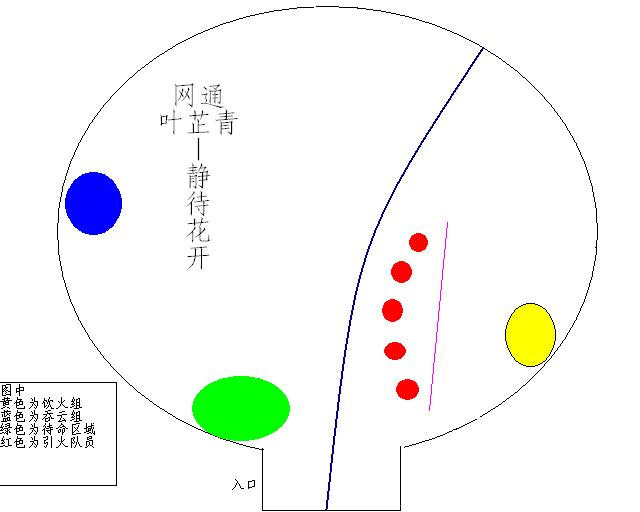 这时场中已经没有龙卷风了,待一轮真烧云过后,替补TANK组的TANK,到黄色区域后不在群嘲,把吞云单拉出来,到蓝色位置,TANK注意靠墙,至此真正进入第三阶段。这个时候饮火,吞云组应该一共有3名治疗,而待命区域应该有5名治疗(之前引火治疗两名,餐风治疗一名,花间万花和冰心七秀切换的治疗两名),可适当的分散3名治疗去吞云,饮火组,但待命区域一定要保持有一到两名治疗随时待命。