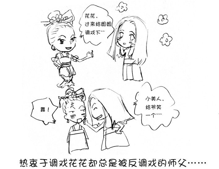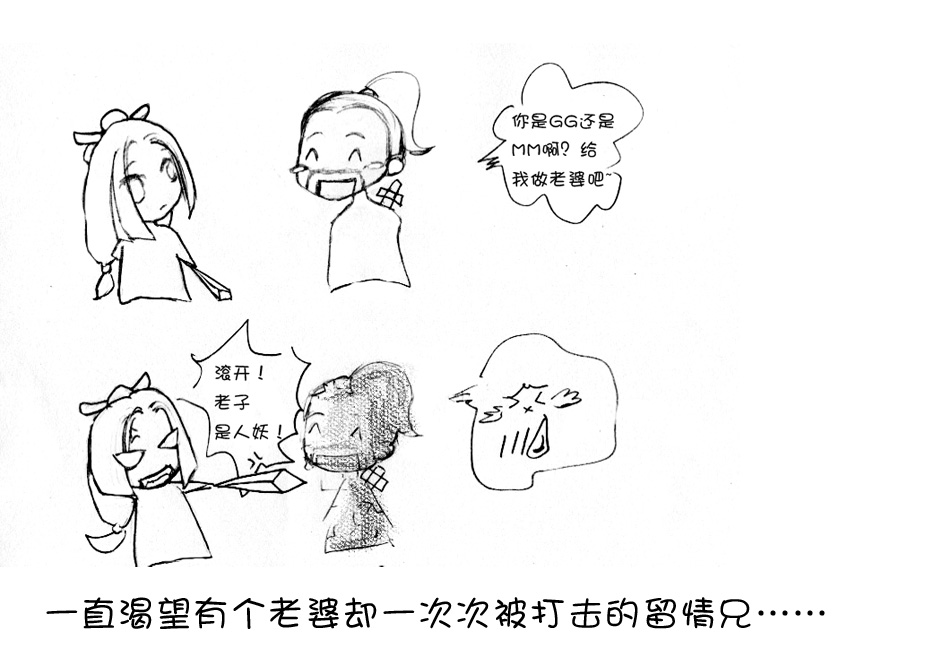 这样一个二十孝师傅注定是多情的~~~我有好多师娘~~~~和师公。师公还有待考证~~~~师傅的绯闻~~~留情兄……也是个多情的人。也做了我 师傅~ 留情兄就喜欢问人家愿不愿意做他老婆,可恨一直遇到人妖…记得有一次好像又是天工~~WH总是和天工很有猿粪~~~~有个美丽的秀秀~~~~留情师傅又想叫人家做他老婆但是有那么多次人妖的经验~~~留情兄自以为很有考虑的问:你是不是人妖~~结果那个秀秀MM生气了留情兄~~我只能说 你活该~~·