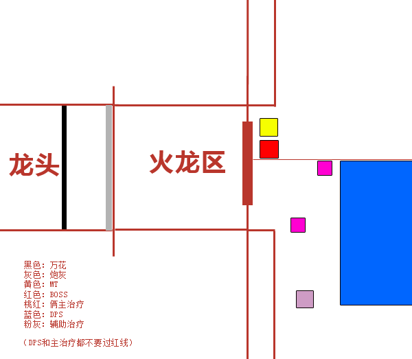 DPS在蓝色区域活动,中火圈,到其他位置,切记尽量远离俩主治疗。(门里只有一个火圈)