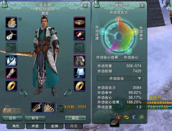 然后把新经脉系统里外功需要的经脉给点上,对比一下前后属性的区别,会心大幅下降,命中略微降低,血量、攻击有所提高。