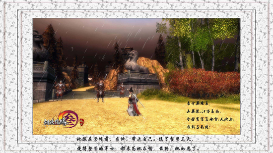 就这样,七秀一呆又是一年,习武的艰辛,几欲魂断,实在是师傅怜之,都给就回来了。是该走的时候了,辞别七秀的众姐妹,她又回到了阔别已久的家,依旧那么冷清,他还没回来,不在稍作休息,直奔了军营。她跪在营帐前,求他,带上自己。跪了整整三天,使得整营的军士,就来为她求情,最终,她如愿了。她为他立下战功,为他奋勇杀敌,她不再是很多年前娇憨的小女子,她成了他的副将。可是在军营里,他不曾与她说过一句夫妻间的情话,这里只有军人,没有亲属。