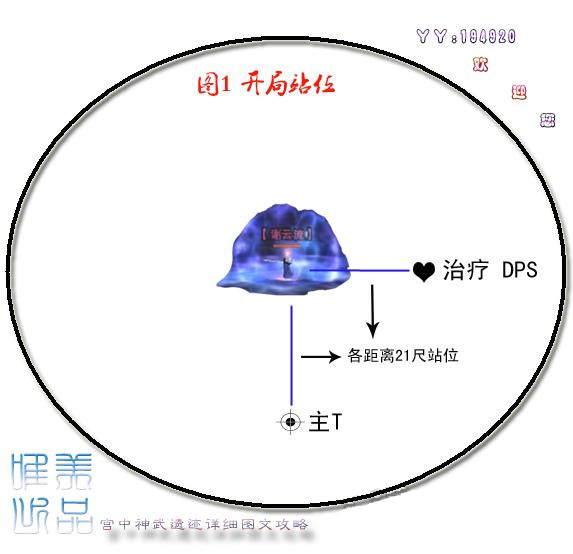 1、开局站位(图一):T站BOSS正面21尺,其他人员BOSS左手边21尺,开怪万花上春泥。