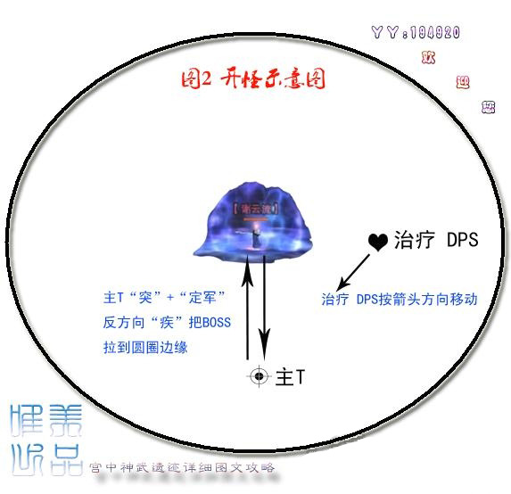 3、开怪后站位和治疗安排(图三):开怪后,T本阶段全程站最前方,不能让任何人超过BOSS对于自己的60度角,以避免除自己外的玩家中BOSS的群伤技能:剑冲阴阳;远程DPS和治疗站在T正前方45度角,离BOSS12-15尺距离。