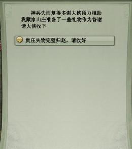 世界提示:藏剑山庄铸造的绝世神兵被盗,具消息盗贼逃往了金水镇,求各位侠士前去找回神兵藏家山庄必有重谢。玩家找到盗贼击杀后会获得绝世神兵。