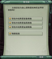 原阵营声望装备、威望装备无法使用,但是可以到三大主城帮会区的李守财处兑换当前阵营的装备,原阵营的马匹在换阵营后依然可以使用,同时也可以在李守财处兑换为当前阵营的