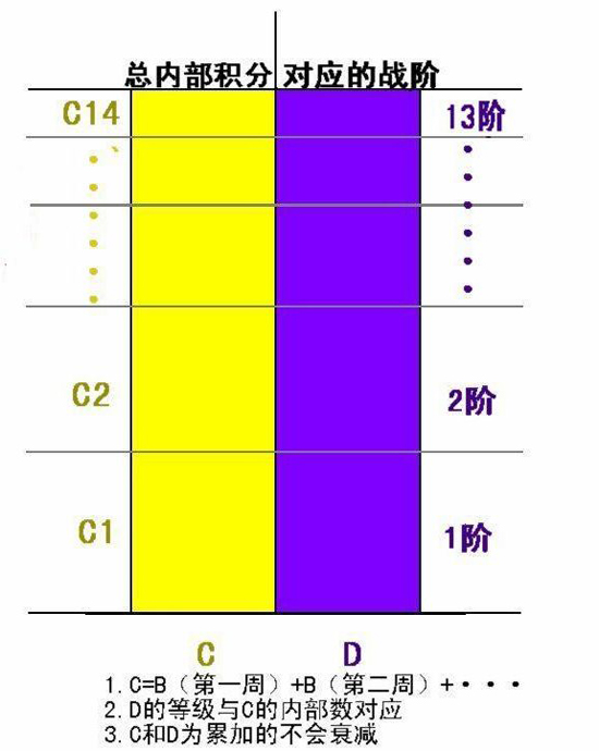 然后你获得的积分B回转移到C上,C=C(原来的值)+B2(本周你获得的值),然后会得到你现在的总值C2,最后将C2带入到D中,与D中升阶所需要的积分对比后得出你所能升级到的战阶,下个星期一生效,依此类推一直到你升到13阶。