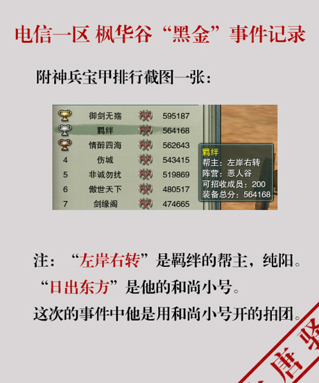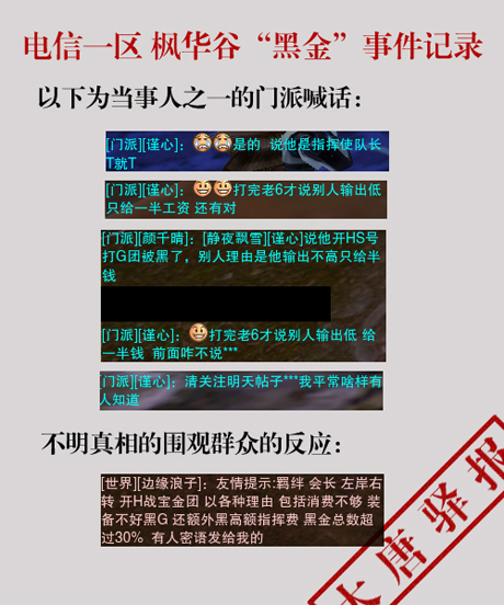 说的是恶人谷帮会“羁绊”的会长“左岸右转”开的英雄战宝拍团黑金。此消息一出,顿时世界上就炸成一锅粥,枫华谷玩家纷纷在世界频道上发言,有讨伐黑金的,有求时间真相的,有骂人的。