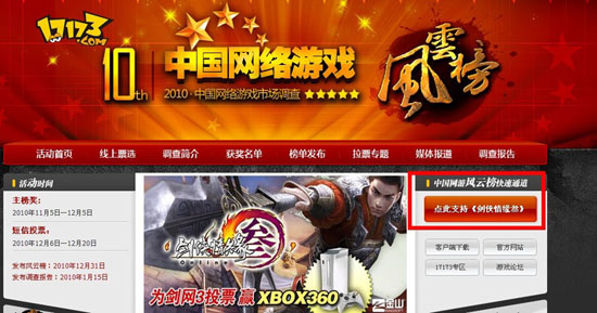 第十届17173“中国网游市场调查暨年度网游风云榜评选”已于11月5日正式启动!《剑网3》作为深受广大玩家喜爱的武侠大作得到了众多媒体和玩家朋友的支持与厚爱,并有幸再次入围角逐多项大奖,轻轻点击你手中的鼠标为《剑网3》投上宝贵的一票,XBOX360、PSP等海量丰厚大礼等你抱回家!
