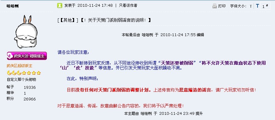 近日不断接到玩家反馈,从不同途径接收到所谓“天策还要被削弱”“将不允许天策在傲血状态下使用‘山’‘虎’技能”等信息。并已引发天策玩家大面积躁动不满。