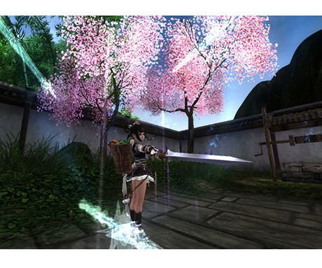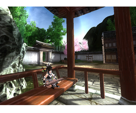 院子里有着斜出墙角的桃花和漂亮的小亭子