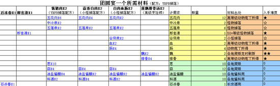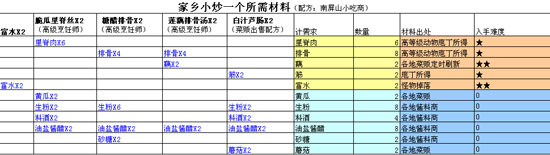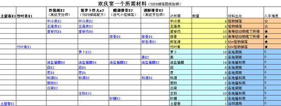 这几天开荒,宴席就像流水一样的走,存货已经没了,今天就想去做一点。做的时候才知道,宴席麻烦啊!一个宴席要5-6个小烹饪做成,一个小烹饪又要好几种原材料去做。搞的头大,想去网上找资料,又找不到傻瓜式的。纠结了一个多小时,才算做好几个宴席,期间还浪费了很多原材料,穷人心疼ning……