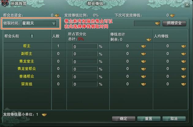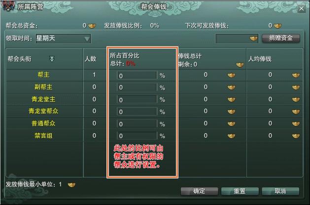 1、在俸钱发放之前,帮主和拥有“管理俸钱”权限的帮众需要进行设置俸钱发放比例,即将帮会资金中的一部分作为俸钱发放给帮众。