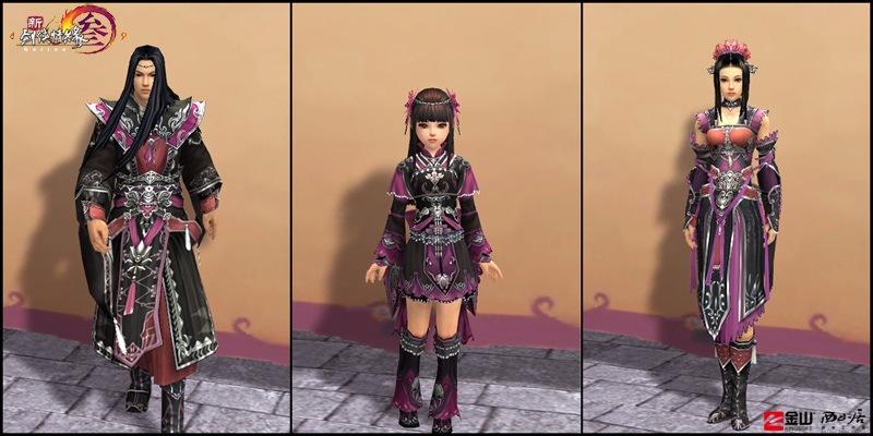 以笔为剑的万花小女孩穿上蚩灵套装后,则是一身得体的黑紫色装扮,尤其是万花使出太素九针时与蚩灵套装更是相得益彰,墨香四溢,别有一番韵致。