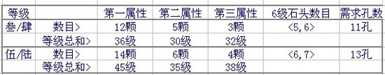 这里只讨论叁,肆,伍,陆级的五彩石,需要的五行石颗数[都用6级石头的前提下],等级总和如下表所示: