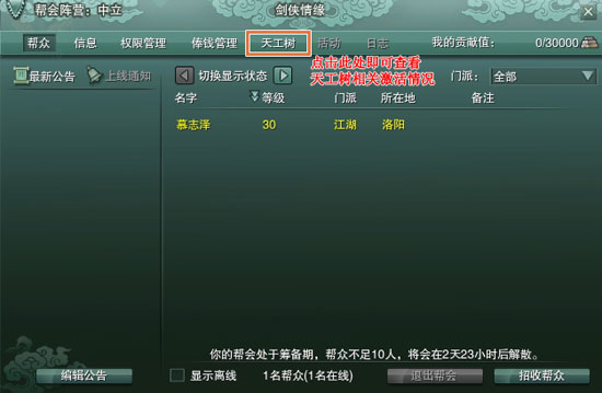 (2)天工树只有帮主在自己的帮会家园中,找到天工树管理员方能激活各个功能,其他帮众成员只可以在帮会界面查看天工树。
