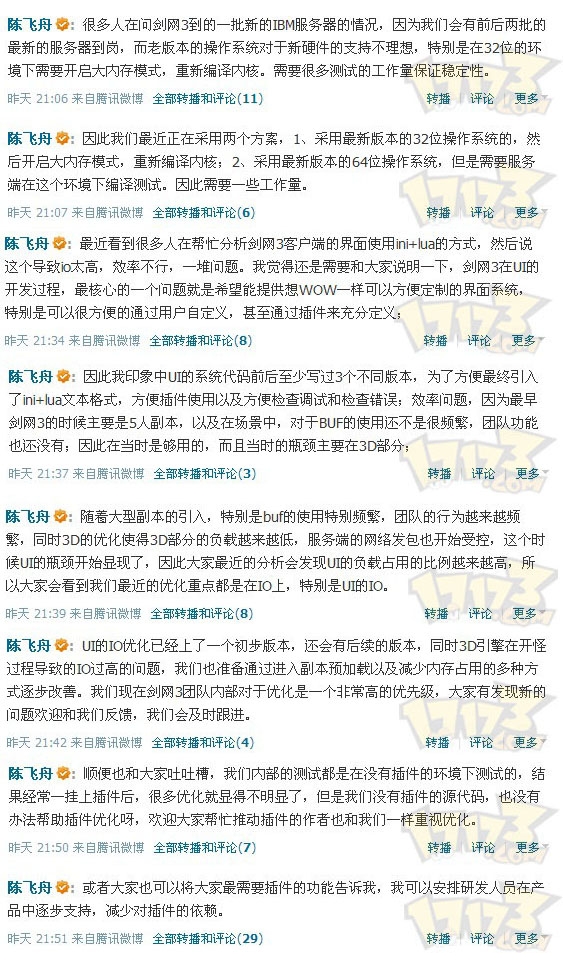 UI的IO优化已经上了一个初步版本,还会有后续的版本,同时3D引擎在开怪过程导致的IO过高的问题,我们也准备通过进入副本预加载以及减少内存占用的多种方式逐步改善。我们现在剑网3团队内部对于优化是一个非常高的优先级,大家有发现新的问题欢迎和我们反馈,我们会及时跟进。