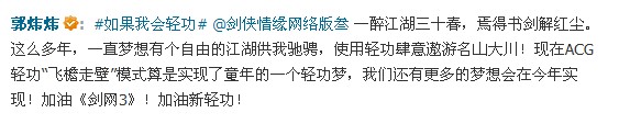 郭炜炜:一醉江湖三十春,焉得书剑解红尘。这么多年,一直梦想有个自由的江湖供我驰骋,使用轻功肆意遨游名山大川!现在ACG轻功“飞檐走壁”模式算是实现了童年的一个轻功梦,我们还有更多的梦想会在今年实现!加油《剑网3》!加油新轻功!