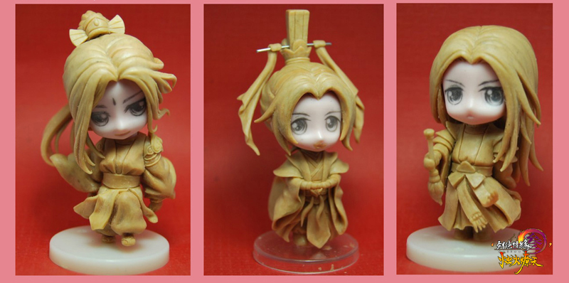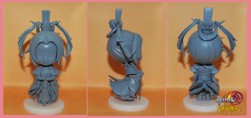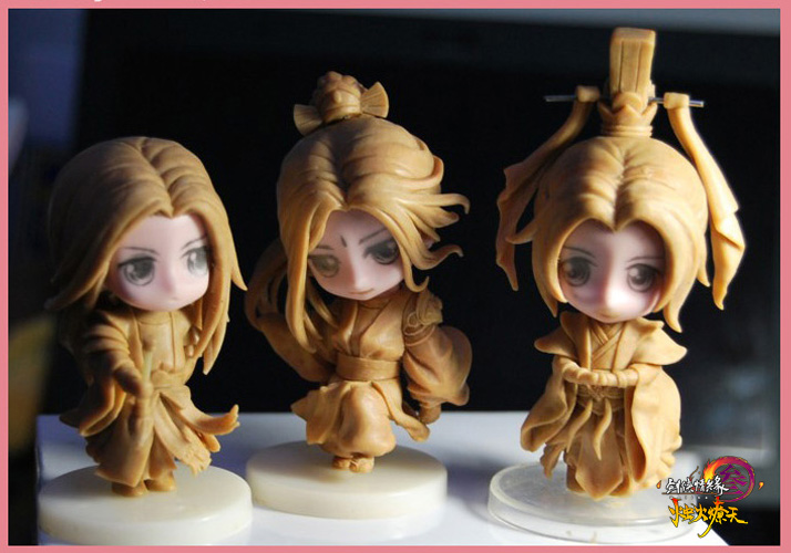 原型设计师用可塑形的PVC材质按照原画亲手制作成立体模型,在未上色的雏形出炉以后,制造师将会对人物具体的动作和填充相应的色彩,通过一系列专业的工具对局部细节做处理。在此过程中,不仅要把人物脸型表情、发型头饰清晰地雕琢,同时对眼神、衣服褶皱等部位也都打磨的十分细腻。