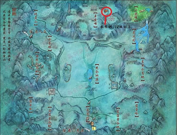58级有个叫破庙的地方,可能很多新手都找不到这个地方在哪,破庙,这里的怪58级以后才有经验,刷新速度快。如果你的等级达到了61级以上,可以选择继续留在这里,也可以选择上图红旗上方有座桥,过了桥就是70级精英怪的刷新点,速度也很快。还有个地方叫长生洞,在昆仑,很多新手也不知道在哪,长生洞,这里62级以后才有经验