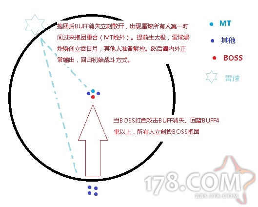 5、分散后大约6-8秒,场上会在随机位置出现一个雷球,MT立刻远离雷球15尺,所有其他玩家迅速找雷球抱团