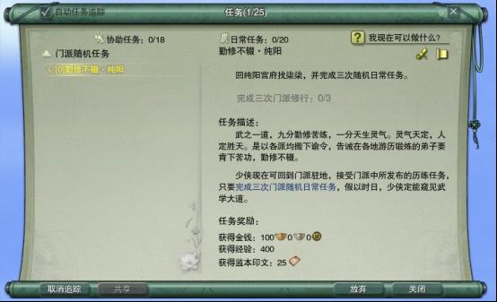完成门派随机任务,即可提升自己在本门中的声望,何乐而不为……