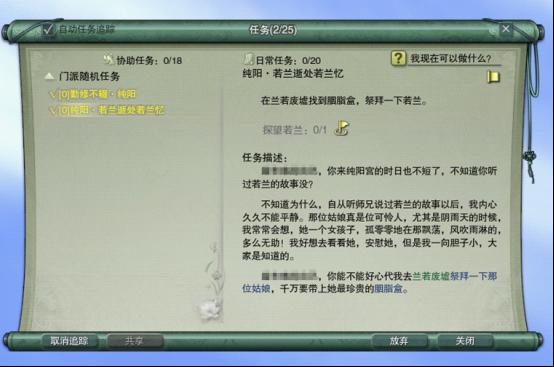 每个门派都有不少符合门派特色的随机任务哦,侠士们可前往探索。