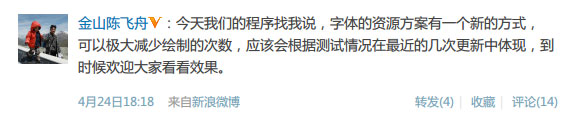 金山陈飞舟:今天我们的程序找我说,字体的资源方案有一个新的方式,可以极大减少绘制的次数,应该会根据测试情况在最近的几次更新中体现,到时候欢迎大家看看效果。