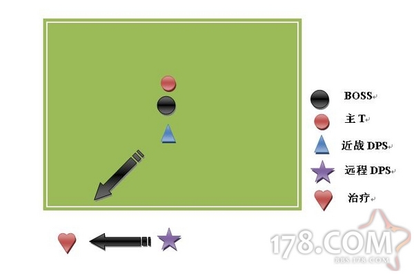 一. 开怪之前治疗和远程直接站好图中的位置,近战直接跟主T上。对!你没看错!就是直接上,不要看有些坑爹的攻略在和尚面前等减伤BUFF,这个BUFF开怪全团都有,跟位置无关,想压榨DPS近战就直接跟上!!记得治疗看好和尚的血!!被秒T什么团都过不了。
