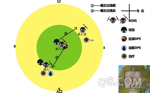 开怪鼠王会先出来,主T拉在中间远程分散站位注意躲好黄球,天地火时候内功停手。打到65%血的时候进入下一阶段。鼠王65%血的时候会回到后面休息,这时候蝠王出来。天策T将BOSS拉到进门位置所有人抱团打,注意风向随时调整位置。
