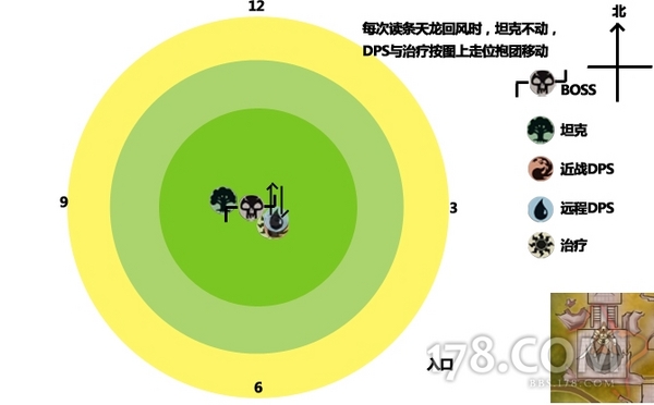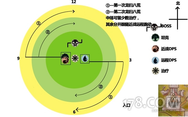 所有人按图站位抱团站,出现天龙回风如图侧向移动不要被击倒,龙行虎步时候所有人踩扶摇等到读条一半时候全团扶摇跳起来可以规避除第一次以外的其余伤害(扶摇二段跳后可接小轻功再接二段跳延长滞空时间),这样躲过他的两次天龙回风以及龙行虎步后BOSS会施展龙扫八荒,第一次龙扫八荒全团按图上跑位,第二次中间留部分治疗其余略小圈跑位,第三次请自行寻找空地。