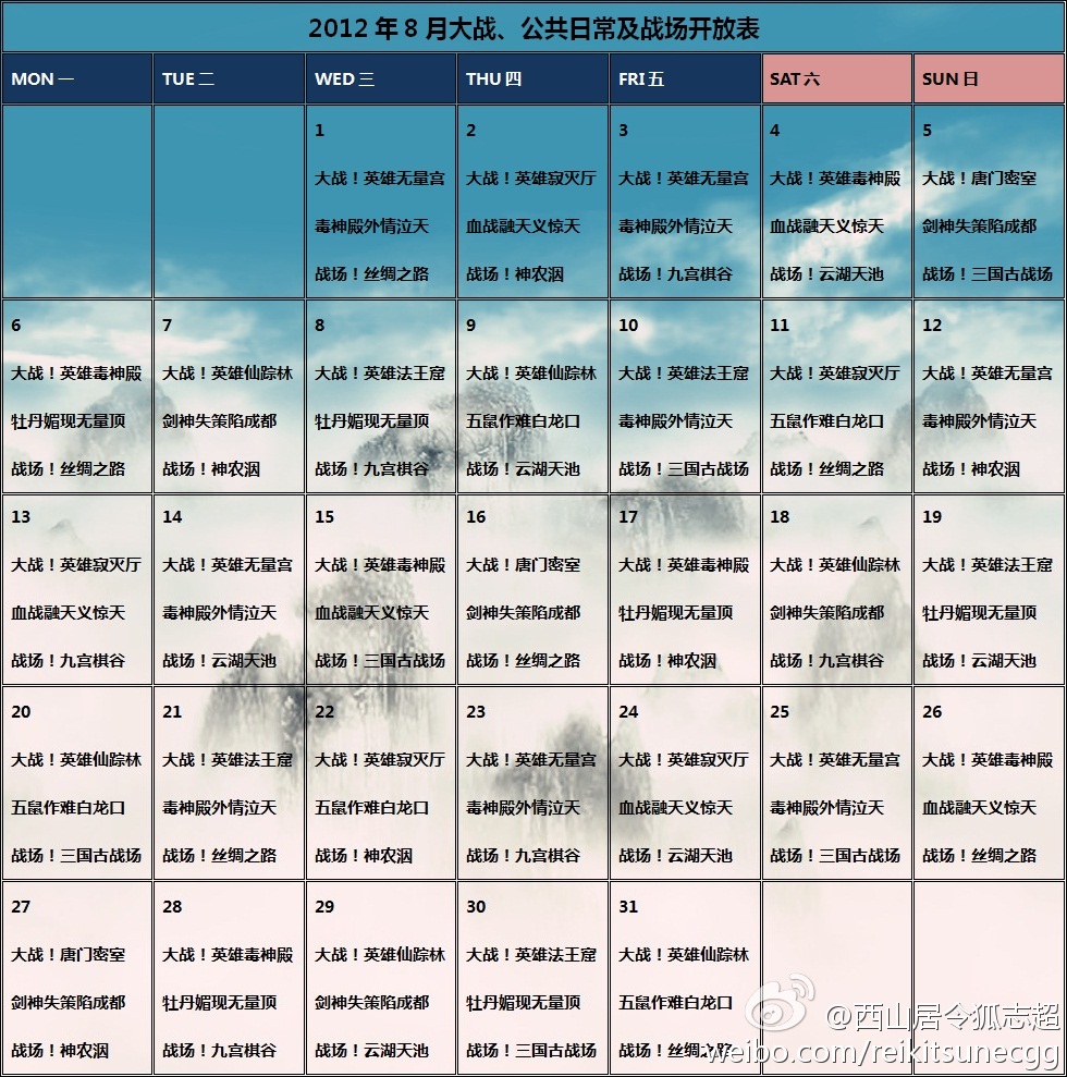 西山居令狐志超:来发个推算出来的8月大战、公共日常及战场时间表,方便大家根据自己时间来安排打团队本的计划。