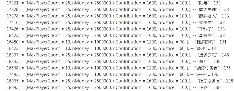 --[BOSSID]={{副本最大人数,BOSS总掉落金钱(铜),BOSS每人掉落帮贡值,BOSS每人掉落侠义值,...}--BOSS中文名..副本地图ID