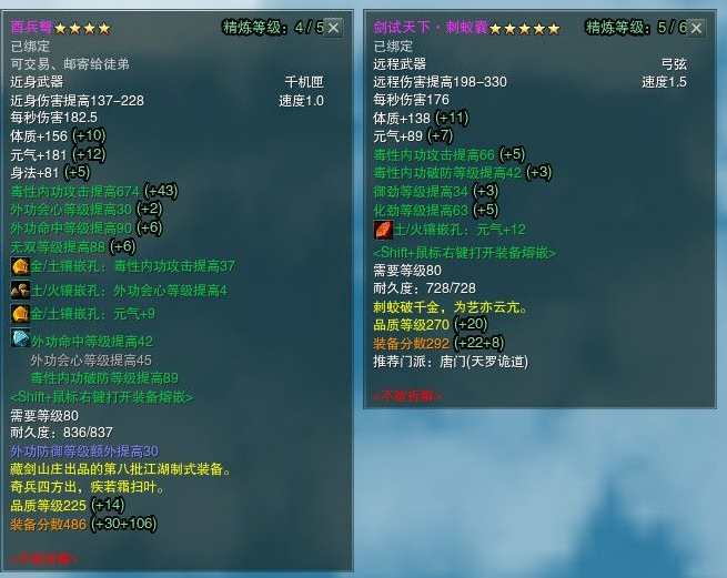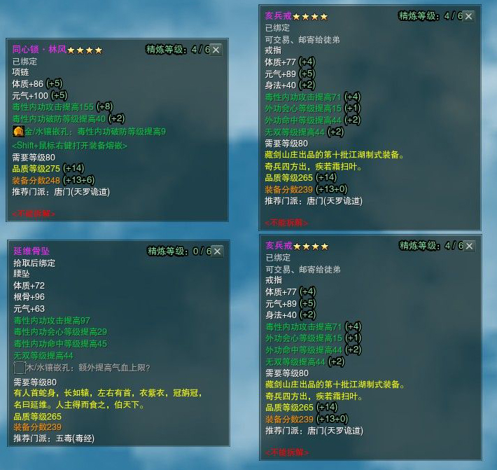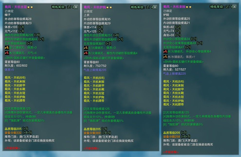 本人的装备分是3881,蜀风全套+2(附魔加气血,注:活着才是DPS),项链是七夕任务给的项链(精炼4级,注:可根据自身财富情况自行选择差异不会非常大),腰坠是265黑龙任务腰坠(五毒毒经的,+会心和命中的)。戒指是帮贡265的戒指(两个,全部精炼4级,可根据财富情况同上),下面是我自身装备的属性和装备图。