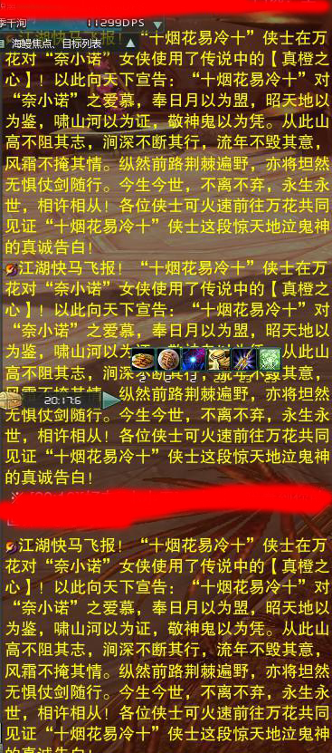 后来99个真橙之心放完了,男主还在世界刷了个至死不渝的成就和一句类似于刷屏见谅的道歉的话!!PS:这点还是很重要的,毕竟你霸屏这么久嘛!!(姐还是怀疑男主放烟花的时候用的是按键精灵,估计人在电脑面前守着的!)然后姐以为要结束了,都点开神行准备回长安了,结果男主和女主又对放了一个海誓山盟!!然后男主很有礼貌的对大家说:谢谢大家,大家请回吧!!之后各种祝福各种要红包的!!(具体有木有红包姐也不清楚,反正姐是不屑做这种事的)