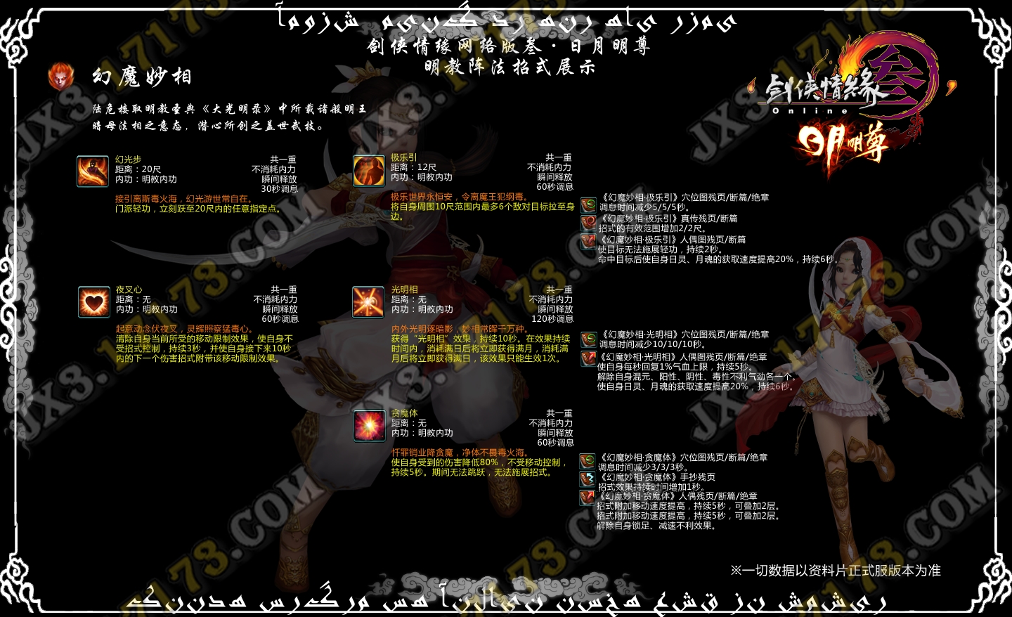 在两大心法之外,明教众多至高武学可供弟子灵活施展。修得【日月净世】武学套路可蓄积日灵月魂之力,日月有别,招式效果亦不尽相同,并瞬间提升自身速度或者回复大量气血。而陆危楼所创的【幻魔妙相】,则取圣典《大光明录》中所载诸般明王暗母法相之意态,静可挪转乾坤,受到攻击可以彼之道还治彼身;而动可移行幻影,**追击无所不利。