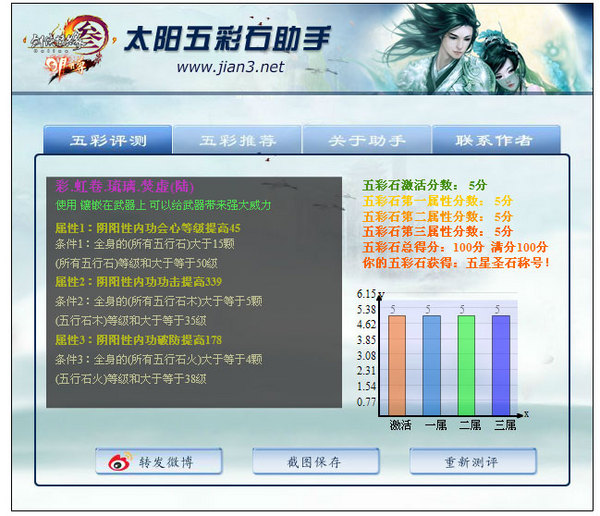 2. 提供五彩石评测功能,评测参数由PVE&PVP领域经验丰富的玩家提供,丰富的图表功能让你清晰了解五彩石每个属性的优劣。