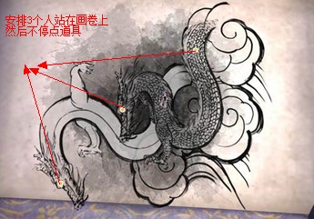 总共3种画卷,每个画卷对应3个站位点,下面是画卷站位点截图~~注意画卷的时候,会有一个紫红的球再作画,一定要等球滚过去再站上去,否则会定身,人群就跟BOSS抱团就好。