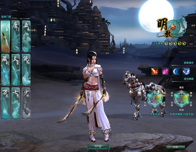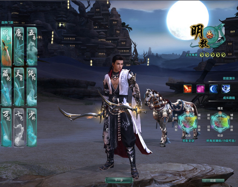 新门派明教分为攻击和防御两个分支,均没有传统的蓝条设定,采用了特殊的日月灵的系统,日套路的技能蓄积日魂,月套路蓄积月灵,当获得满月或满日的时候可以使用强力的爆发技。从笔者测试的情况来看,攻击分支是一个类似于刺客的定位,有强力的突进和隐身技能,但操作较复杂,上手需要一定的时间。防御分支拥有较强的闪避成长,但内外防御不高,更适合作为辅助。总体而言是个可玩性很高而难于精通的门派。