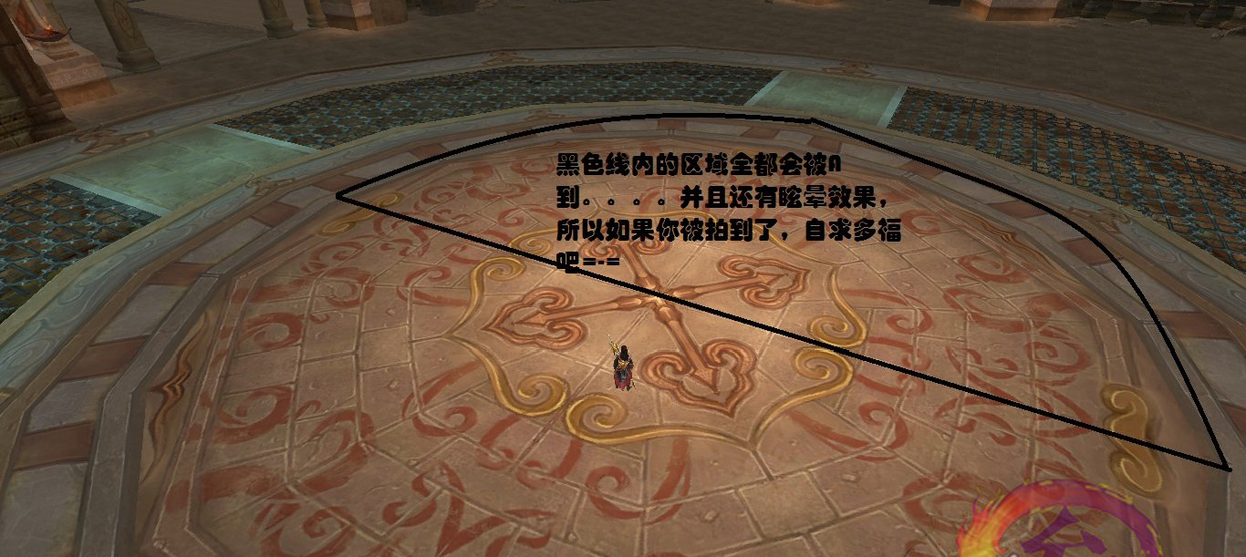 BOSS20%以上血的技能已经介绍完了,然后是20%以下血量以后的技能,好吧其实就一个技能,没有具体名字。就是一个无脑大范围AOE。