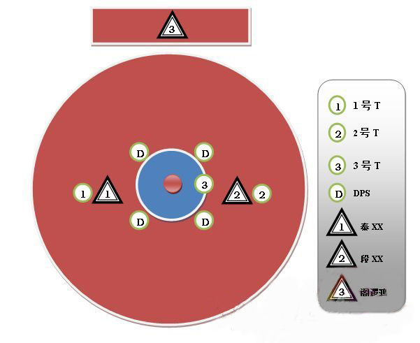 P1:如图所示,1号T和2号T拉住相应的boss到指定位置,3号T内圈待命。中间会出4波泰拳手,个数为2、3、3、2,同时刷新枪斧兵,个数为1、2、2、1。团长安排集火掉泰拳手(要求DPS要暴力,有一个集火不掉就重来吧),3号T拉住刷新的枪斧兵。DPS打完泰拳手后打枪斧兵,枪斧兵打至残血,T拉到中间吃掉落的红球,在枪斧兵读条完秒掉。另外中心处指挥安排单独的DPS去吃掉落的绿球,会中“躁动的能量”,远离人群就行。2号boss段XX会有正面AOE“狂杀”,安排三个治疗全程去挡,以免我方NPC被杀,“狂杀”很慢,无压力的。