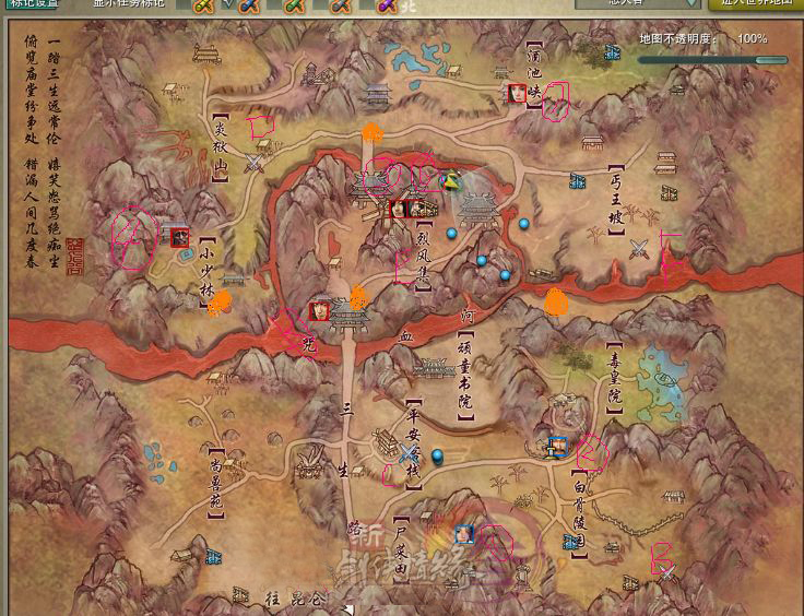 以带大家熟练抱团为名,从A慢慢到尚善苑的苑字抱团。恶人一般会在三与生字的三叉路口协防。再让大家跟随标记动,稍作挪动,到尚书苑的上括号了之后,你仔细看一下到小少林黄圈的距离。是三岔路口近还是上括号离得近。此时轻功飞。到左黄圈高点抱团打坐回气力等恶人,恶人必不敢飞去与你抢点。3、4、7、6随意你怎么打都可以。大家都很舒服再有掉队的?估计不能够了。注意一点,为什么不是在咒血河第一个高点,守那个桥的要隘。因为
