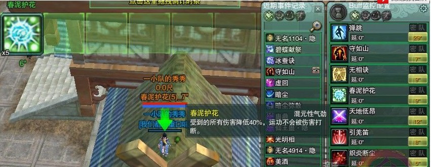 由于条件有限,猪龙店CD已经打过了。就用春泥来代替一下。你看一般的团员名字是蓝色的。要是他身上带着你监控的BUFF,他头顶就多了一排字,这聋子都能看的见了。