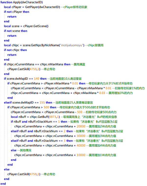 但是在技能脚本(南诏皇宫_莫雨_传输内力.lua)中发现如下内容(绿字是我加的注释):