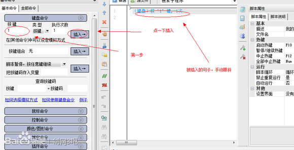 找到新建界面键盘命令,点击按键按按钮,按一下技能1键,然后插入这条语句(要轻轻的插)。