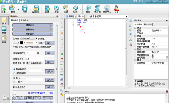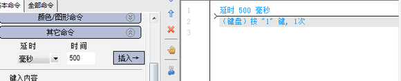 忘了说一点,我们要在脚本开始加一个延迟么。延迟半秒种开始运行脚本,点击“其他命令”里面的延迟,把秒改为毫秒,500毫秒是半秒钟插入到脚本里。