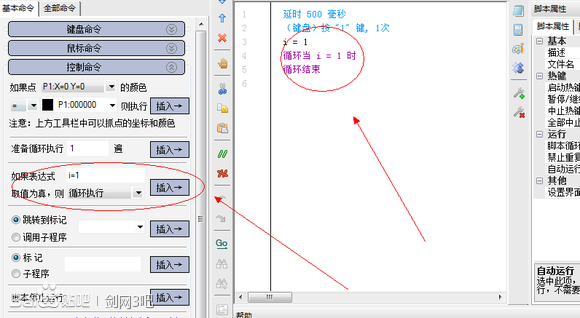 刚才我们切换到命令栏源文件了,现在切回到普通编辑界面,点击控制命令,找到“如果表达式为”在后面填上变量i=1。然后下一行“取为真值”后面有个向下的箭头,点击,选中循环执行。插入这条语句~~